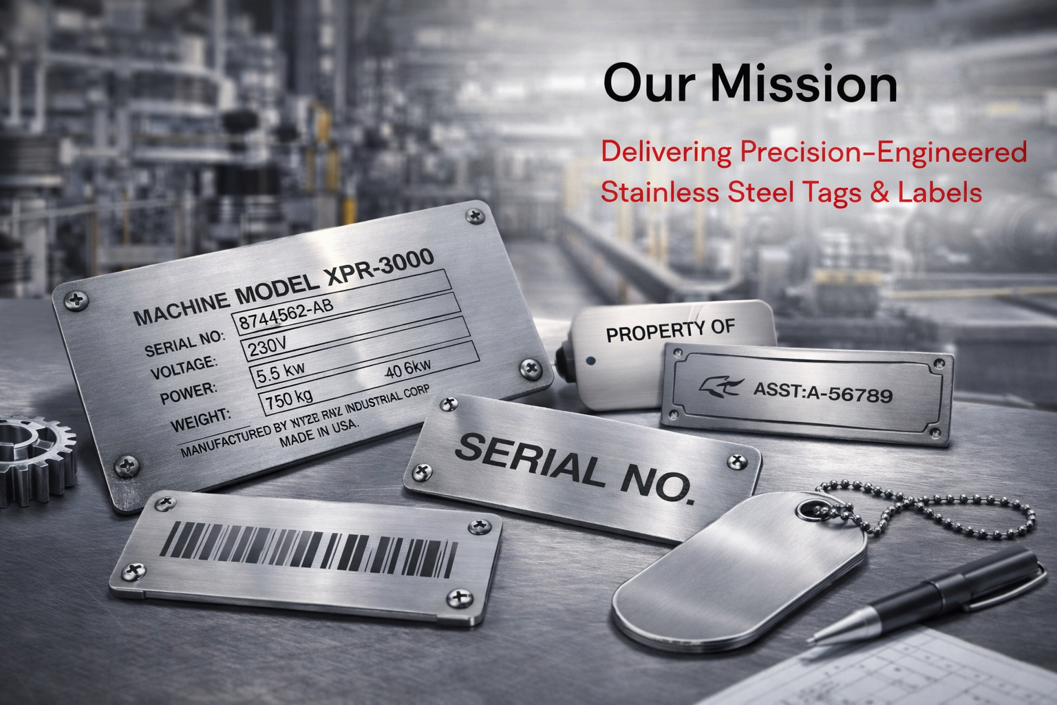 Our mission is to deliver precision-engineered stainless steel tags and labels that offer long-lasting performance in demanding environments. We are committed to maintaining the highest standards of quality, durability, and customer satisfaction while providing customized solutions for businesses across various sectors. By combining advanced engraving technology with expert manufacturing processes, we ensure every product meets the exact needs of our clients.