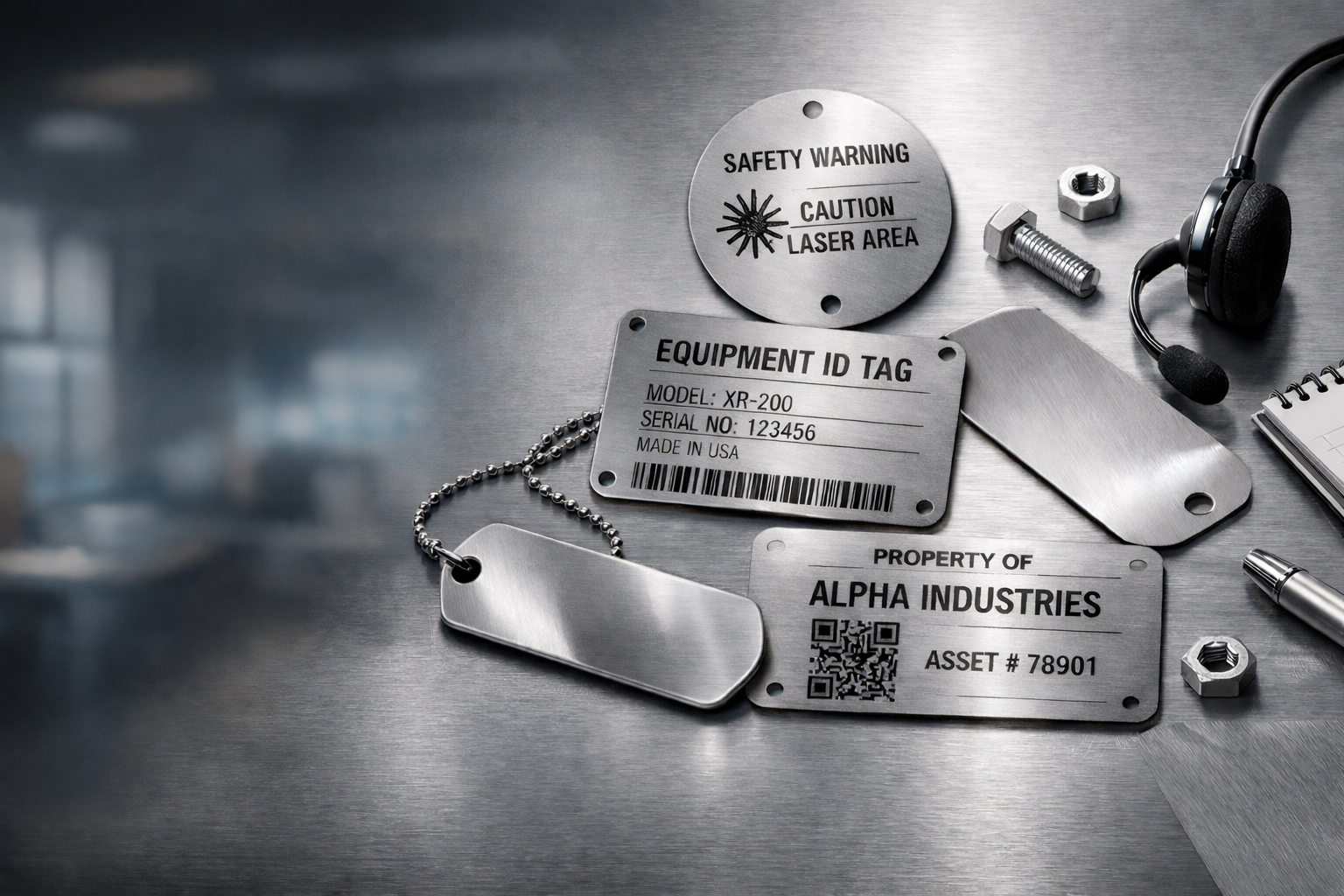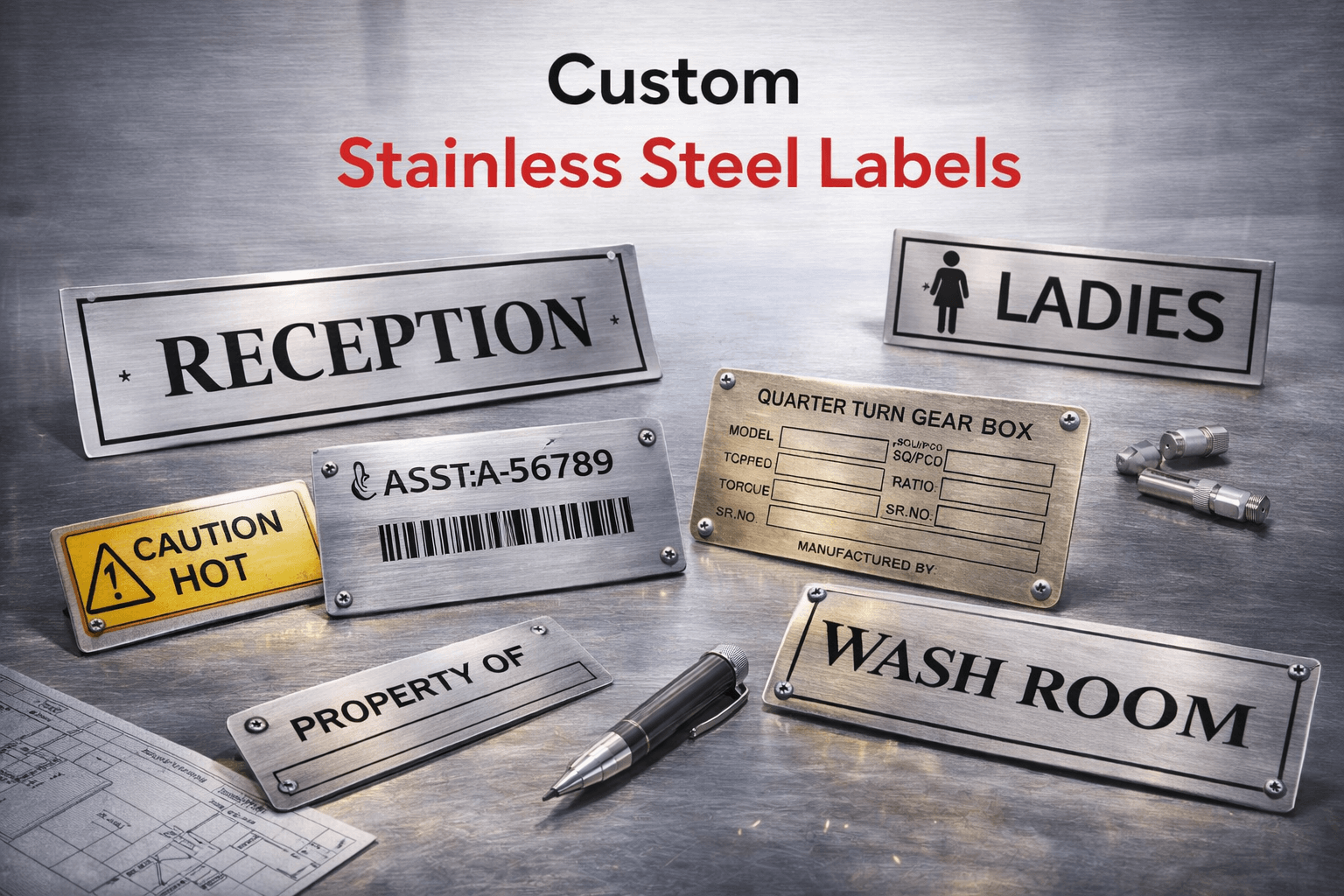 These labels are ideal for industrial equipment, asset identification, safety instructions, branding, and product labeling. Each label can be fully customized with logos, serial numbers, barcodes, QR codes, or technical specifications, helping businesses maintain proper identification and compliance.